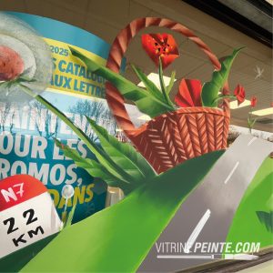 Exemple de DĂ©corations Tour de France 2026 pour vitrines de magasins, Office de tourisme, mairies, collectivitĂ©s : Nous vous conseillons un Kit dĂ©corations Ă©tĂ© et tour de France sur-mesure avec de nombreux Ă©lĂ©ments peints directement sur vos vitres par nos artistes. Drapeau, vĂ©lo, Parasols, fanions mais pas seulement…