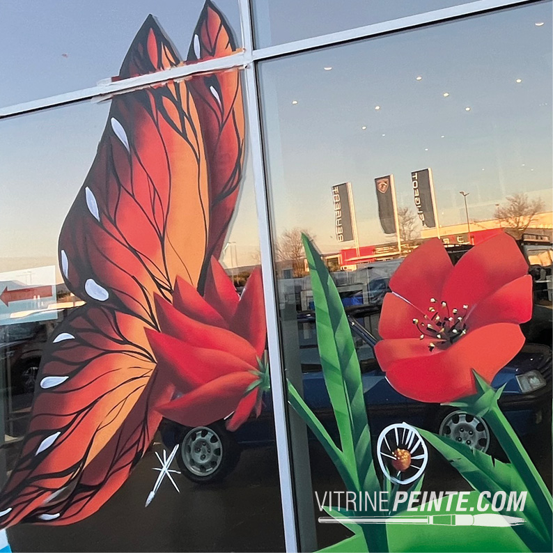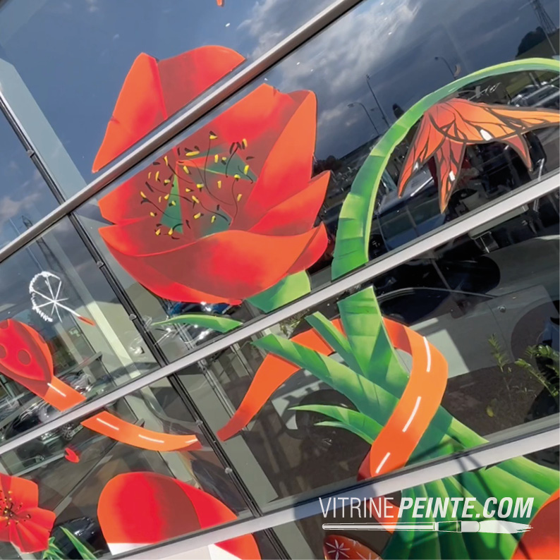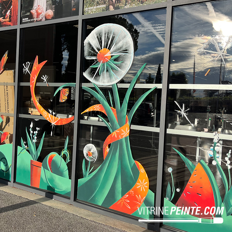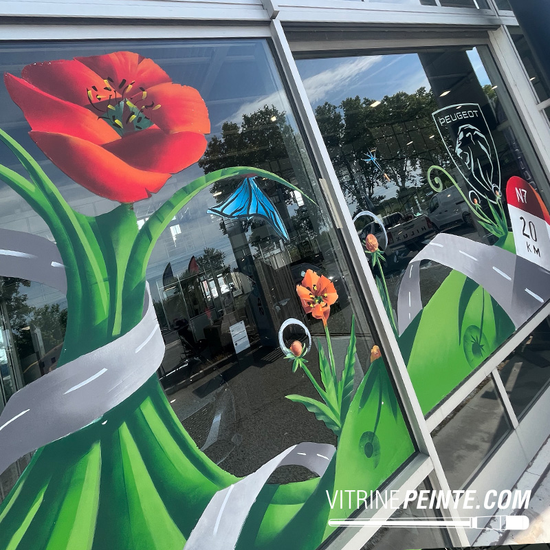 Créez une ambiance florale format XXL avec des fleurs géantes artificielles peinte à la main. Invitez la nature au cœur de votre commerce de manière artistiques, élégante et durable. Nos bouquets floraux seront transformer vos vitrines de magasins dans un décor de Printemps. Des peintures sur vitre pensées pour les pharmacies, boulangeries, maries, collectivités ou associations… Pour les commerçants désireux de marquer les esprits et de renforcer leur image de marque.